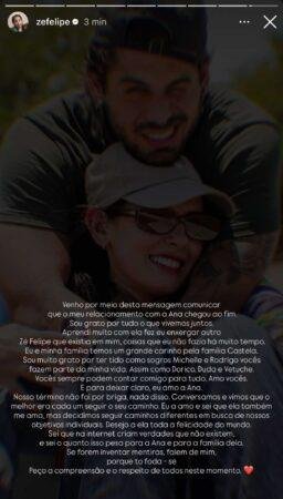 O filho do cantor Leonardo fez questão de expressar sua admiração pela agora ex-namorada. Em suas palavras, ele disse amar Ana e saber que o sentimento é recíproco, mas que o contexto atual exigia o distanciamento. Ele também aproveitou para agradecer o tempo de convivência e o aprendizado adquirido durante a relação.